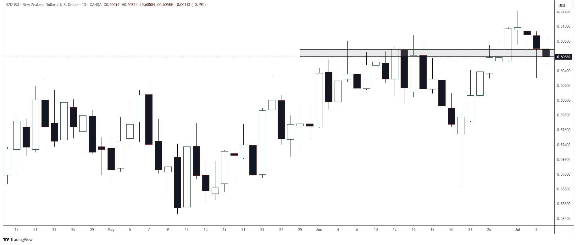 NZDUSD is testing an area of support (prior resistance). I will likely go long if I see bullish candlestick price action.