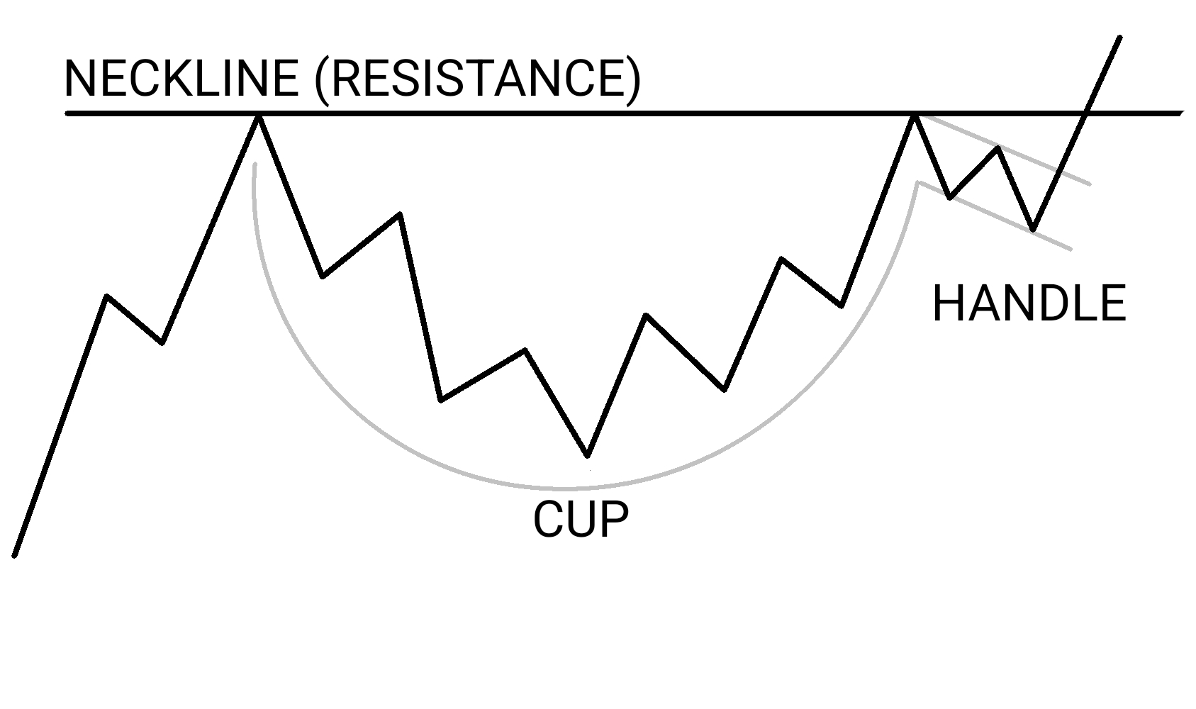 - The Handle: A brief, sideways / slightly down-sloping consolidation after the cup formed. Brief, meaning the consolidation of the handle is smaller and forms faster than that of the cup. Think flag or pennant.